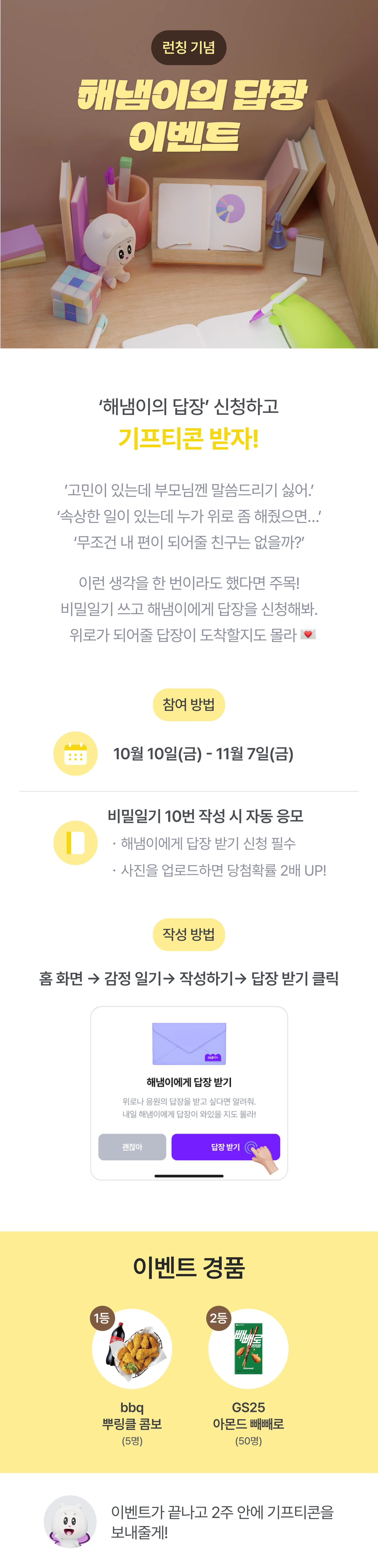[종료된 이벤트] 해냄이 답장 신청하고 기프티콘 받자! (10/11~11/7)