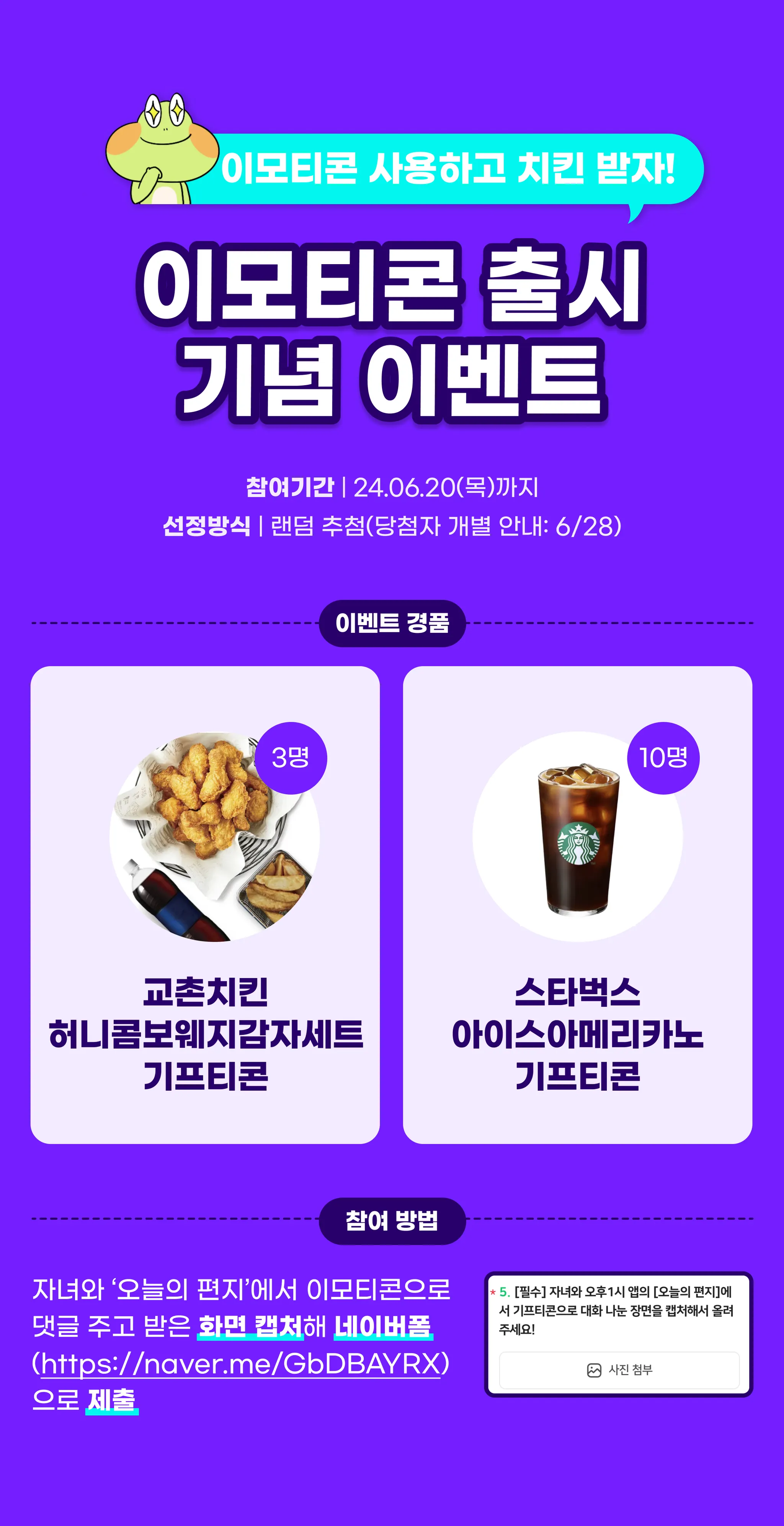 오후1시 이모티콘 출시를 기념해 이벤트를 준비했어요.